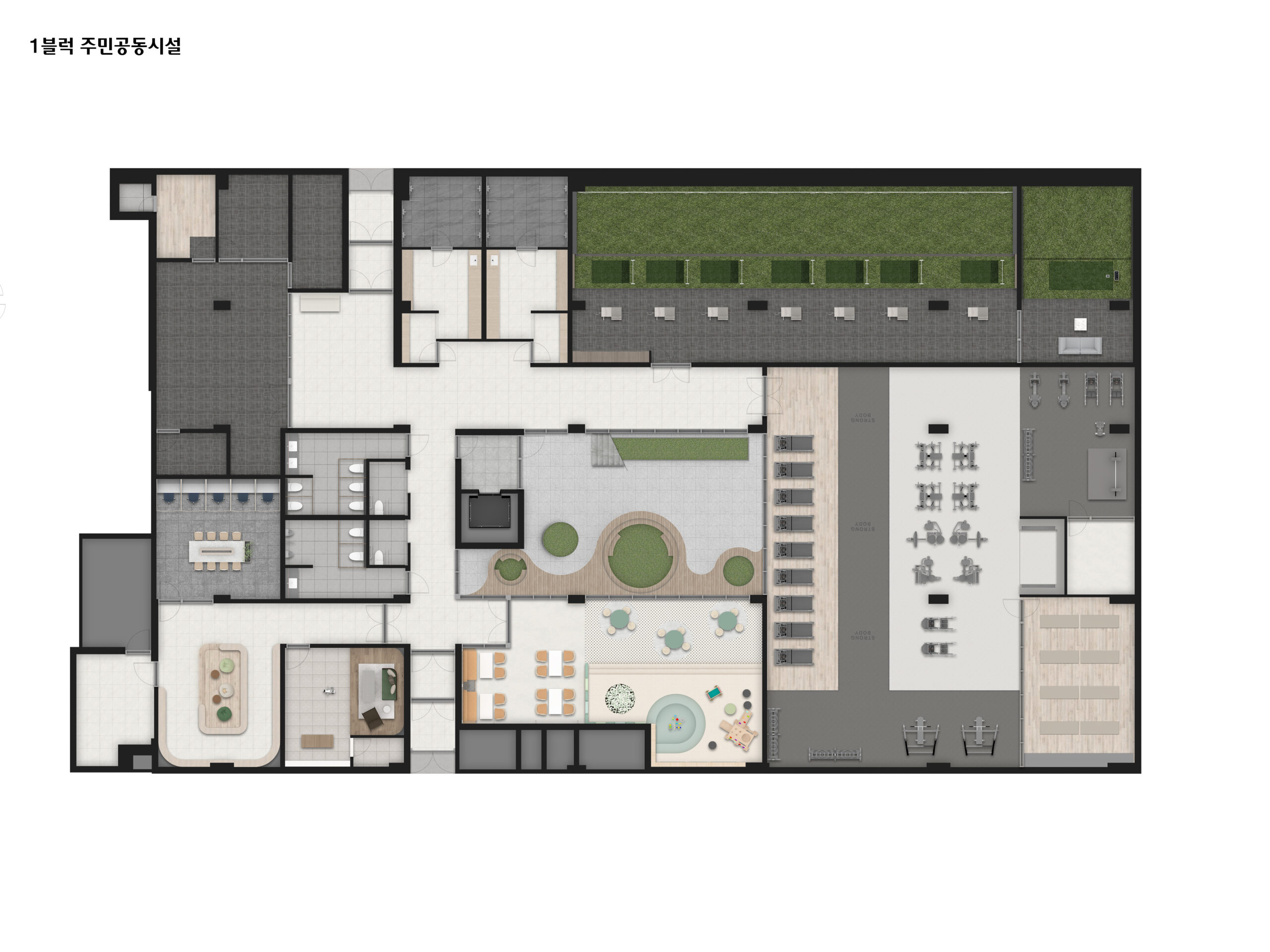 ❶ 피트니스 ❷ 골프연습장 ❸ 탈의실, 샤워실(남/여) ❹ 키즈그라운드 ❺ 작은도서관 ❻ 크리에이티브 스튜디오